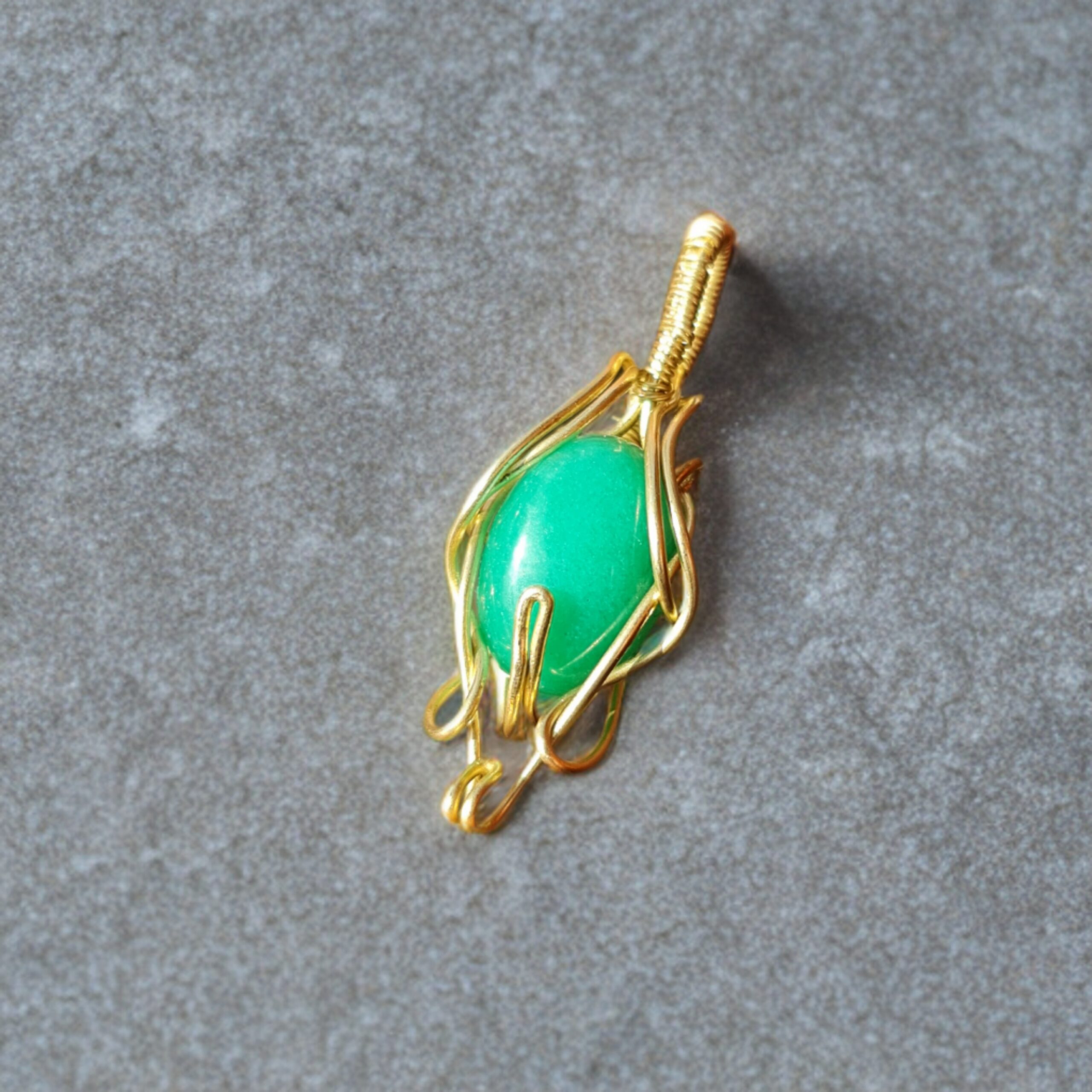 این گردنبند خاص و چشم نواز از سنگ یشم سبز(جید) ساخته شده و با رکاب دست ساز برنزی به سبک هنری و ارگانیک طراحی شده است. فرم آزاد و پیچان رکاب، الهام گرفته از طبیعت است و حس رشد، جریان و زندگی را تداعی می کند.